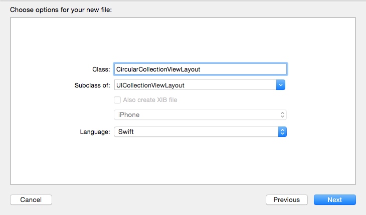 点击下一步、创建。这个UICollectionViewLayout的子类将包含所有与位置相关的代码。 因为CircularCollectionViewLayout继承自UICollectionViewLayout而不是UICollectionViewFlowLayout,所以你需要处理所有布局过程而不是简单调用 super 中的实现。