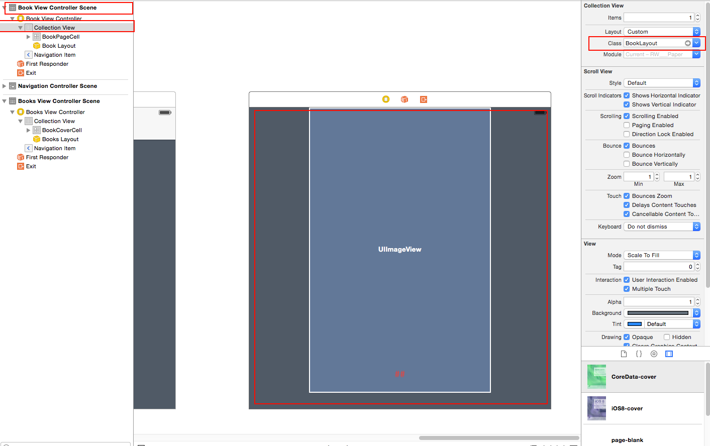 在你滑动的过程中,最接近屏幕中心的封面将会变大一些来表示它当前被选中。继续滑动,封面将会变小,这意味着你将它移到一边即远离屏幕中心。 在 App\Books 下创建一个名为 Layout 的分组,然后右击 Layout 文件夹选择新建文件,然后创建一个继承自UICollectionViewFlowLayout的子类,取名为BooksLayout,语言为 Swift。 接下来你需要告诉BooksViewController的 collectionView 使用你新建的 Layout。 打开Main.storyboard,选中BooksViewController的Collection View然后在右侧的Attributes Inspector将 layout 设置为 Custom,Class 设置为 BooksLayout,如下图所示: