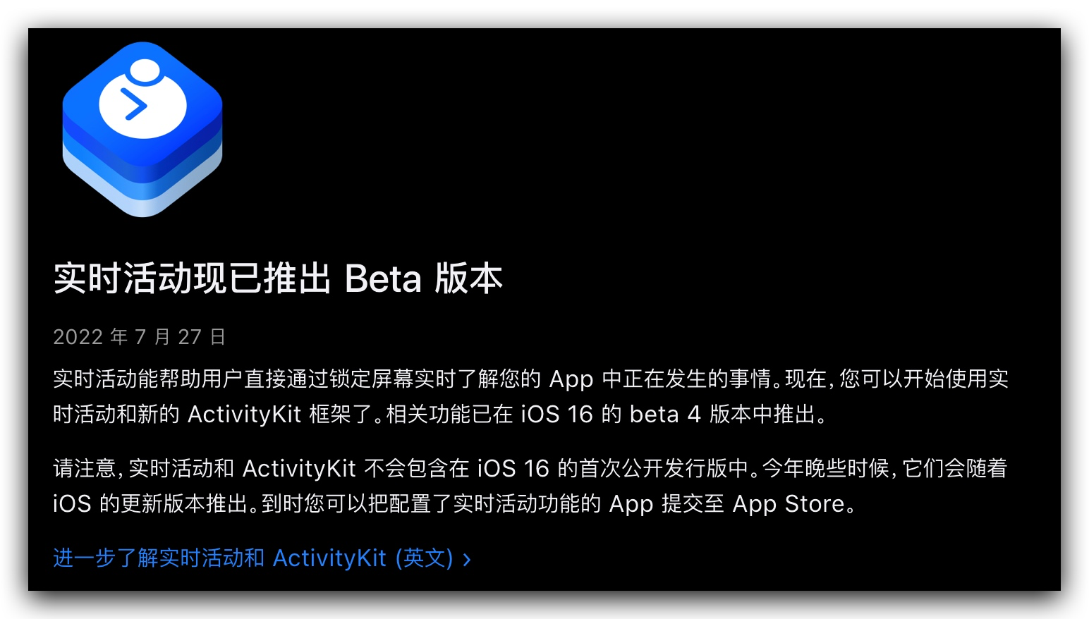 WWDC 2022 Keynote 中苹果给我们介绍了 iOS 16 中一个比较亮眼的更新:Live Activity(实时活动),开发者可以在锁屏页面上放置一个可以“实时”更新的 Widget,比如外卖或者打车应用,在开启实时活动之后我们可以在锁屏页上实时看到外卖小哥/司机与我们的距离及预计到达时间。但是这一 API 及对应功能并没有第一时间放出,而是随着 iOS 16 Beta4 一起放出:【实时活动现已推出 Beta 版本】。