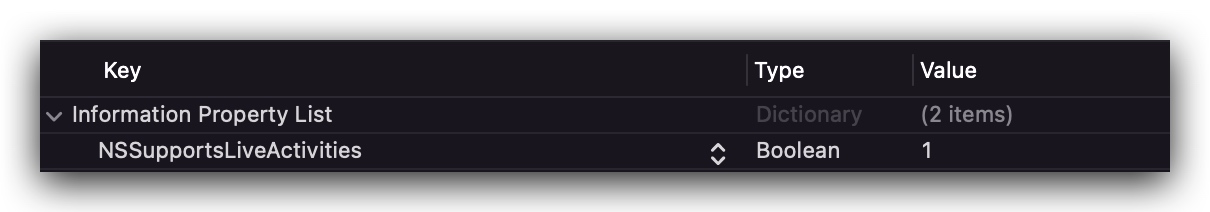 Info.plist文件中添加一个键值对,key 为NSSupportsLiveActivities,value 为YES;