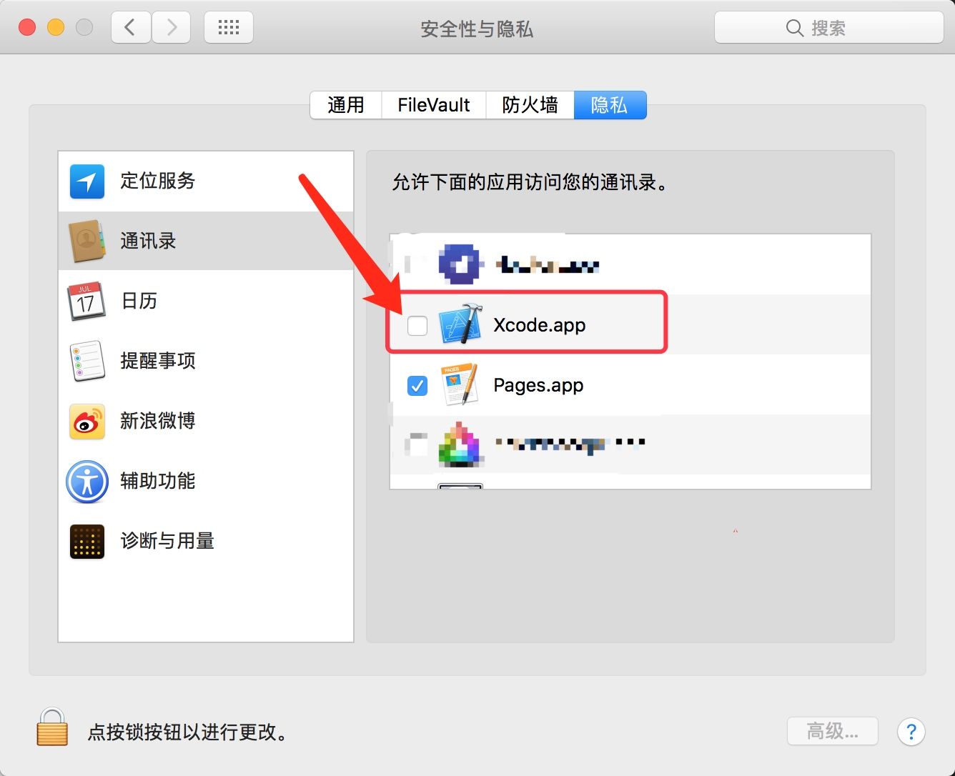如果你的 XcodeGr8 时不时就转菊花卡死,可以试下这种方式:打开系统偏好设置->安全性与隐私->通讯录->将 Xcode 前面的勾去掉,如下图所示,解决方案来自 Xvim 的这个 issue。