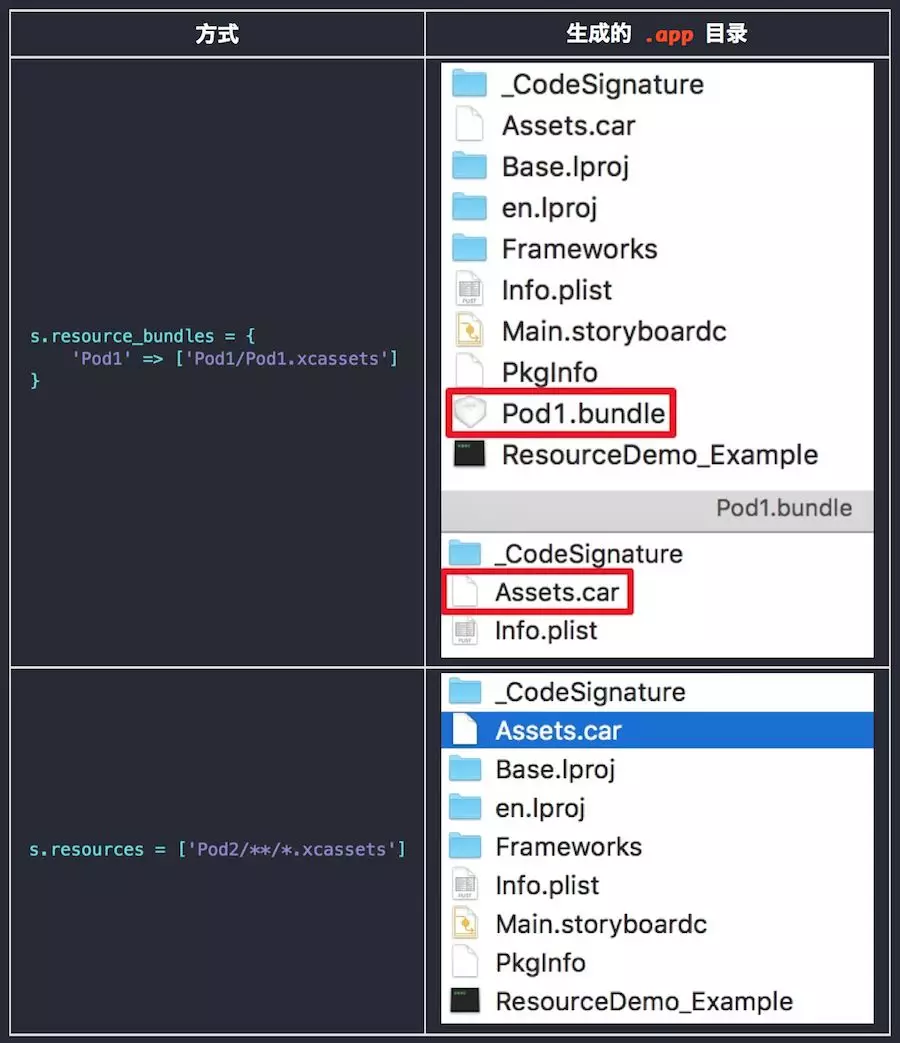 而 resource 的形式,会把 .xcassets 打包到应用根目录下的 Assets.car 中。
