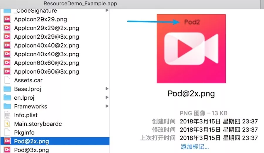 pod install 之后再跑一下,发现 icon 回来了,但是图片还是被主工程覆盖了,查看 .app 文件,我们发现根目录下多了两张图片,他们来自于 Pod2 目录下。